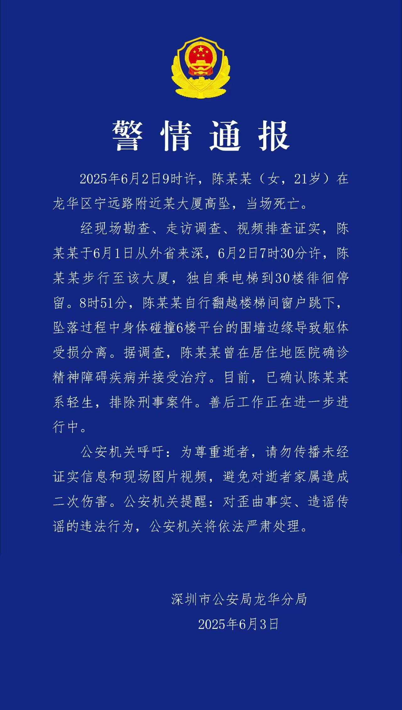 6月3日晚,深圳龙华公安通报称,2025年6月2日9时许,陈某某(女,21岁)在龙华区宁远路附近某大厦高坠,当场死亡。